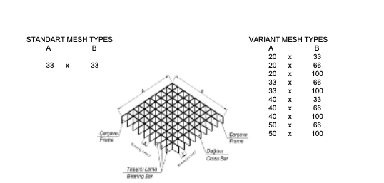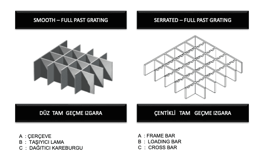 Proje ihtiyaçlarına göre farklı ebat, taşıyıcı aralık ve malzeme seçenekleriyle üretilebilen tam geçme ızgaralar, sahada hızlı ve pratik montaj imkânı sağlar. Kullanım koşullarına bağlı olarak sıcak daldırma galvaniz, elektro galvaniz veya paslanmaz çelik alternatifleriyle korozyona karşı üstün dayanım sunarak uzun ömürlü bir çözüm oluşturur.