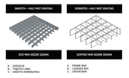 Yarım geçme ızgaralar; bir yönde taşıyıcı lamaların, diğer yönde ise bu lamaların yarı yüksekliğinde bağlayıcı lamalarla birleştirilmesiyle üretilen özel ızgara sistemleridir. Bu tasarım, ürüne yüksek dayanım ve uzun kullanım ömrü kazandırır.